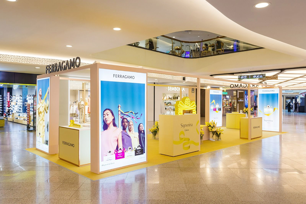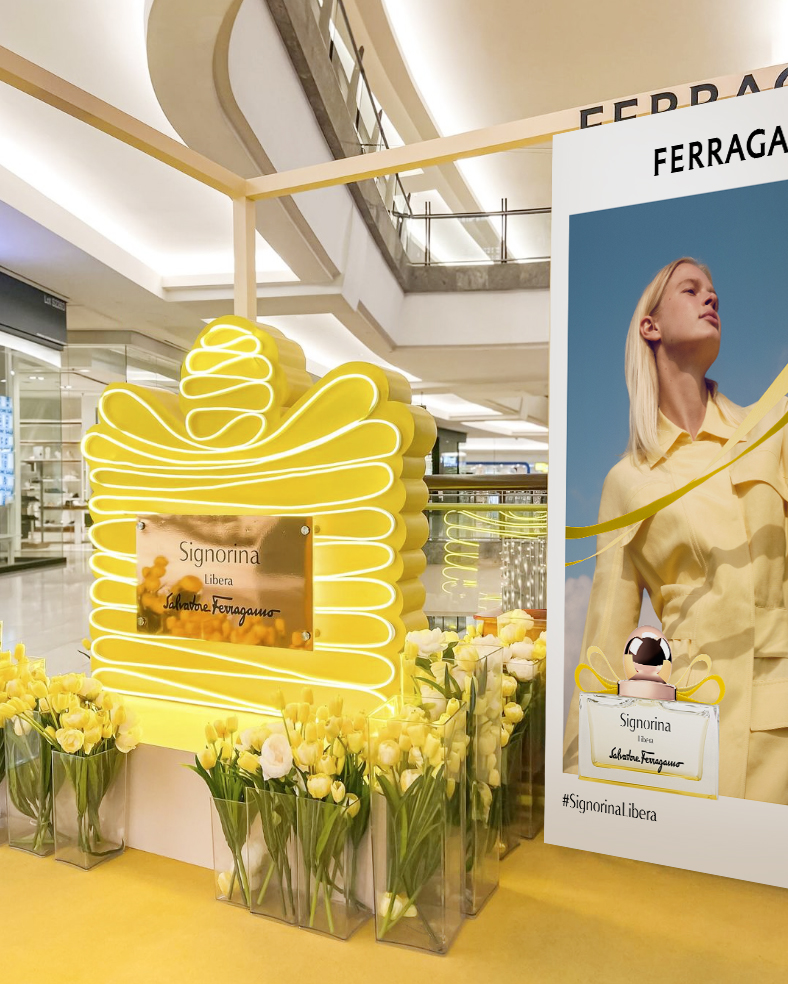 Matíz designed the event’s merchandising, capturing the essence of freedom and joyfulness with twirling yellow ribbons, applied to glorifiers, counter displays, and giant bottle silhouettes.