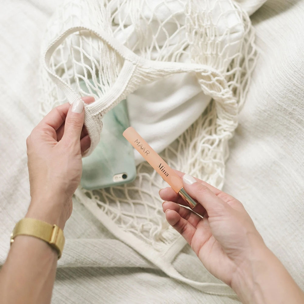 We designed for MAAR Fragrances the 10ml roll-on and its cover : a sleeve protecting the roll-on made from pineapple leaves! Finally we found a plastic-free vegan leather.