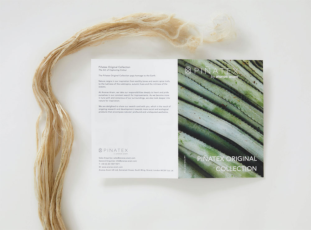 Piñatex® addresses these issues as a sustainably sourced textile, made from a natural waste product, created low water use and low production waste, containing no harmful chemicals or animal products. The leaves are the byproduct of existing agriculture, and their use creates an additional income stream for farming communities on the Philippines.